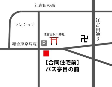 ※北口改札を出て1番バス乗り場から【中27 江古田の森】行に乗り、【合同住宅前】バス停で降りたら目の前